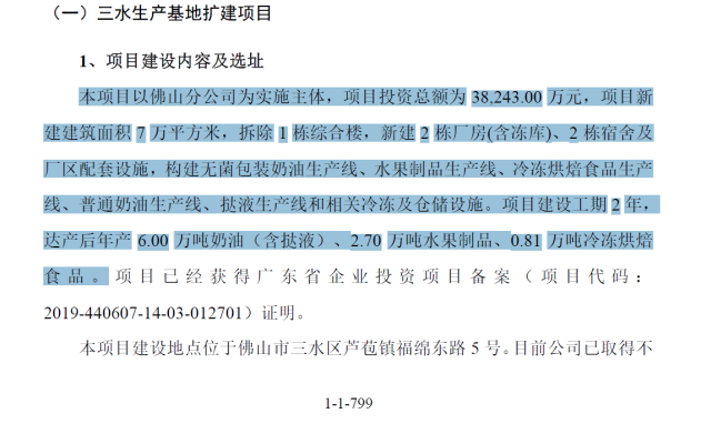 而立高食品《招股书》则显示,三水生产基地扩建项目达产后,年产6.00万吨奶油(含挞液)、2.70万吨水果制品、0.81万吨冷冻烘焙食品。