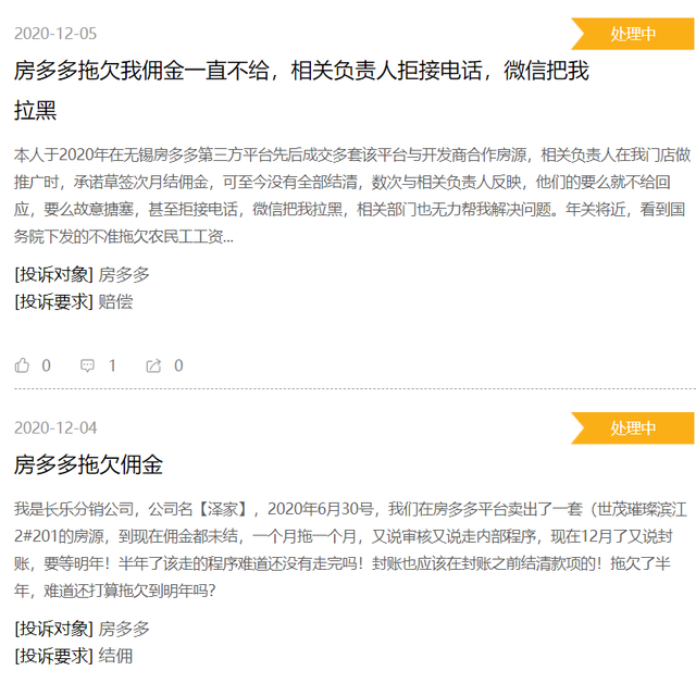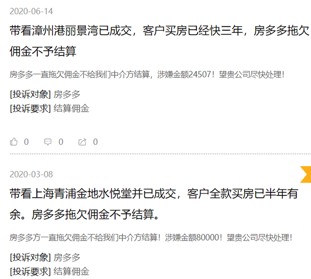 黑猫投诉显示,房多多一直拖欠中介佣金不予结算。但房多多二季报却显示大幅增长,截至2020年6月30日,房多多平台拥有142万注册经纪商户,相较于2019年同期的107万增长32.7%。2020年第二季度,累计活跃经纪商户数超26.5万,相较于2019年同期增长26.9%。二季度,房多多平台上线的新房项目数为2918个,同比增长24.9%。二季度,房多多闭环GMV为500亿人民币(约71亿美元),营收7.4亿人民币(约1.0亿美元),净利润1190万人民币(约170万美元)。