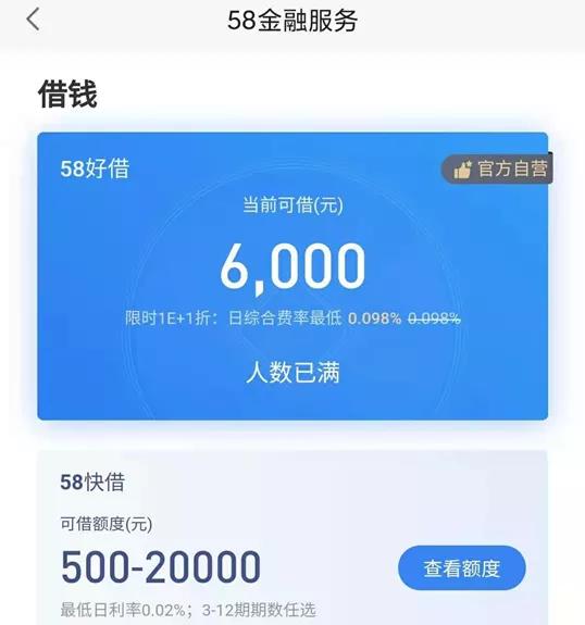 探长读财注意到,58金融自营贷款品牌——58好借已连续多日提示“人数已满”,但58好借页面显示小编当前可借6000元。