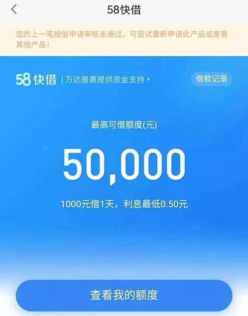 与此同时,58金融合作贷款品牌——58快借似乎也在收紧发放贷款,小编尝试申请同样被提示“额度申请未通过”。根据页面提示,58快借由万达普惠提供服务,最高借款额度5万元,1000元借一天,利息最低0.5元。