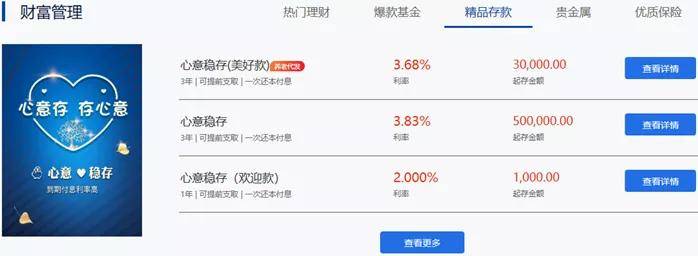 虽然通过58同城APP与“上行财富”签约失败,但探长读财在上海银行官网注意到,上海银行财富管理业务涵盖基金、存款、贵金属,以及保险产品。其中,存款产品包括心意稳存(美好款),3年期,支持提前支取,年化利率3.68%,起存金额3万元;心意稳存(非江浙地区),支持提前支取,年化利率3.08%,起存金额3万元。
