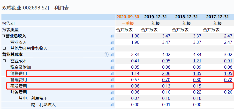 值得注意的是,虽然双成药业介绍中,标榜自身从事药品研发,但发现网对比数据发现其研发费用支出占比并不大,且远低于销售费用。Wind数据显示,双成药业2020年前三季度销售费用、研发费用分别为1.14 亿元和 830.33 万元;2018年-2019年销售费用为1.85亿元和2.06亿元,同期研发费用为1453.20万元和1413.06万元。