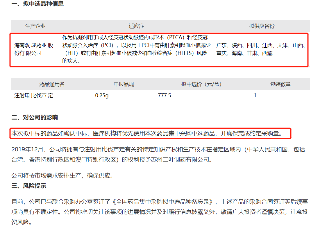 目前已通过仿制药质量和疗效一致性评价的药品注射用比伐芦定拟中标本次集中采购。本次拟中标的药品如确认中标,医疗机构将优先使用本次药品集中采购中选药品,并确保完成约定采购量。不过,上述产品的采购合同签订等后续事项尚具有不确定性。