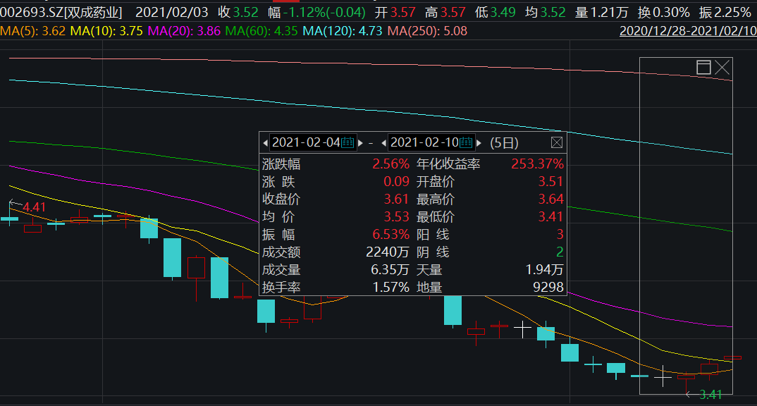 此利好消息投资者似乎并不买账,消息公布当天(2月4日),双成药业股价为3.50元/股,2月5日股价不变。截至2月10日,双成药业股价为3.61元/股,区间涨幅2.56%。
