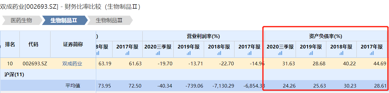 同时,2017年-2019年及2020年前三季度双成药业资产负债率分别为44.69%、40.22%、28.68%和31.63%,同期行业平均值为28.61%、30.23%、25.63%和24.26%。