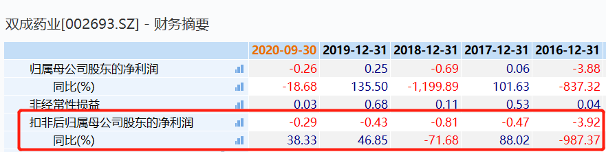 不过,发现网跟踪历年数据发现,如若双成药业2020年扣非净利润仍为亏损状态,那么双成药业便已连续五年亏损。Wind数据显示,2016年-2019年,双成药业扣非净利润分别为-3.92亿元、-0.47亿元、-0.81亿元和-0.43亿元,同比增速-987.37%、88.02%、-71.68%和46.85%。