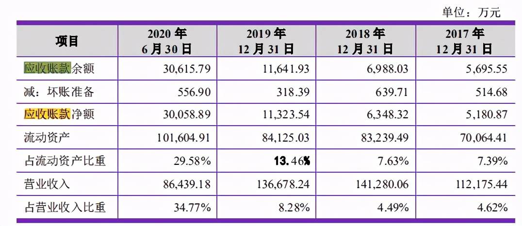 2017年-2020年上半年各期末,中农联合的应收账款余额分别为5695.55万元、6988.03万元、1.16亿元和3.06亿元,占当期流动资产的比例分别为7.39%、7.63%、13.46%和29.58%。应收账款余额持续增长,占比不断增加。