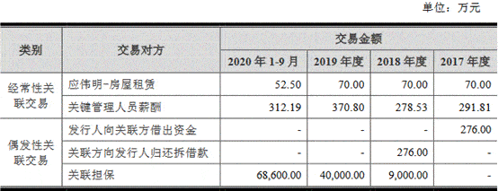 报告期内,应伟明为老鹰教育及其子公司的银行借款提供的关联担保。2018年、2019年和2020年1-9月,关联担保金额分别为9000万元、4亿元、6.86亿元。