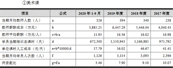 截至报告期各期末,老鹰教育美术课月均教师人数分别为238人、340人、394人、326人,教师平均薪酬分别为16.98万元/人、16.02万元/人、16.36万元/人和11.93万元/人;当期月均学员人次数分别为2396人、3093人、3114人和1126人;师资配比分别为10.07、9.10、7.90和3.46。