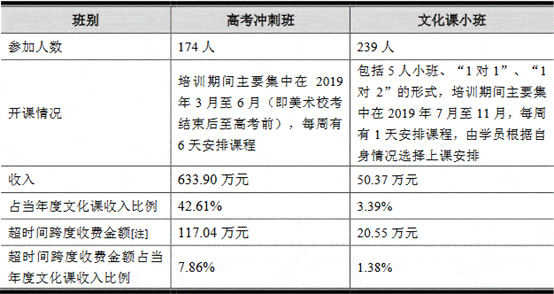该意见发布后,老鹰教育2019年高考冲刺班及2019年文化课小班涉及超时间跨度收费的情形。其中,高考冲刺班、文化课小班超时间跨度收费金额分别为117.04万元、20.55万元,占当年度文化课收入比例分别为7.86%和1.38%。