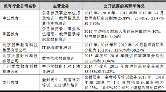 根据公开信息披露,教育行业披露了教师离职率情况的主要公司包括中公教育、华图教育、北京翡翠教育科技集团有限公司、北京火星时代科技有限公司、广州龙文教育科技有限公司和龙门教育。其中,中公教育2015年、2016年、2017年和2018年1-4月教师离职率分别为25.88%、25.48%、21.47%和7.96%;华图教育2017年讲师及教职人员的留任率约为80%,对应离职率约为20%;北京翡翠教育科技集团有限公司2015年、2016年和2017年1-9月教师离职率分别为15.10%、32.90%和39.27%;北京火星时代科技有限公司2015年度和2016年度讲师离职率分别为22.22%和31.06%;广州龙文教育科技有限公司2014年度和2015年度讲师离职率分别为58.68%和51.82%;龙门教育全封闭中、高考补习培训业务2017年、2018年和2019年1-4月教师离职率分别为10.28%、18.52%和2.61%(调整为可比口径)。