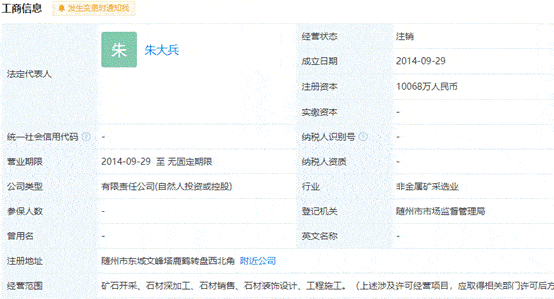 不过,记者通过查询发现,只查询到一家名为随州大地矿业有限公司的企业,成立于2014年9月29日,经营范围为矿石开采、石材深加工、石材销售、石材装饰设计、工程施工。且该公司已于2015年11月13日被注销。