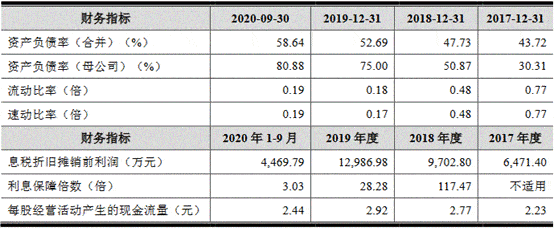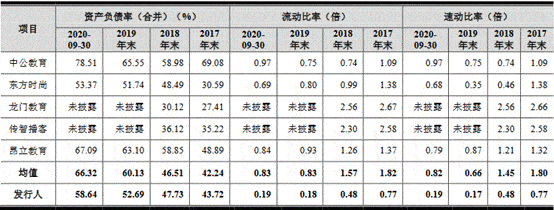 2017年末、2018年末、2019年末及2020年9月末,老鹰教育合并资产负债率分别为43.72%、47.73%、52.69%及58.64%;资产负债率(母公司)分别为30.31%、50.87%、75.00%和80.88%;流动比率分别为0.77、0.48、0.18和0.19;速动比率分别为0.77、0.48、0.17和0.19。