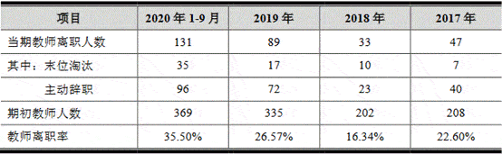 2017年度、2018年度、2019年度和2020年1-9月,老鹰教育专职教师的离职人数分别为47人、33人、89人和131人,离职率分别为22.60%、16.34%、26.57%和35.50%。其中,末位淘汰辞退人数分别为7人、10人、17人和35人,主动辞职人数分别为40人、23人、72人和96人。