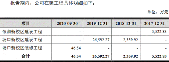 根据招股说明书,2017年末在建工程余额主要系自建银湖校区发生的建设工程支出,该校区于2018年5月达到预定可使用状态转入固定资产;2018年末及2019年末在建工程余额主要系自建场口校区发生的建设工程支出,公司2018年以出让方式获取该校区的土地使用权,2018年底该工程进入正式施工建设阶段,截至2019年12月末尚未完工。该工程为本次募投项目,于2020年6月达到预定可使用状态,2020年7月开始正式投入使用。