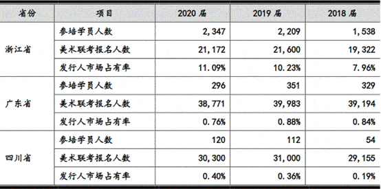 其中,2018届、2019届和2020届学员中,老鹰教育在浙江省的市场占有率分别为7.96%、10.23%、11.09%;在广东省的市场占有率分别为0.84%、0.88%和0.76%;在四川省的市场占有率分别为0.19%、0.36%和0.40%。
