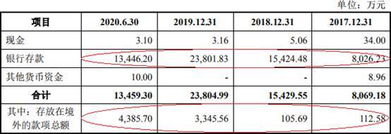 2017年至2020年1-6月,亚康万玮银行存款分别为8026.23万元、1.54亿元、2.38亿元、1.34亿元,存放在境外的款项总额分别为112.58万元、105.69万元、3345.56万元、4385.70万元。
