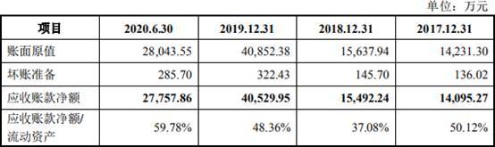 2017年至2020年1-6月,亚康万玮应收账款账面原值分别为1.42亿元、1.56亿元、4.09亿元、2.80亿元,应收账款净额分别为1.41亿元、1.55亿元、4.05亿元、2.78亿元,占流动资产比例分别为50.12%、37.08%、48.36%、59.78%。