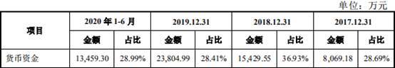 2017年至2020年1-6月,亚康万玮货币资金分别为8069.18万元、1.54亿元、2.38亿元、1.35亿元,占流动资产比例分别为28.69%、36.93%、28.41%、28.99%。