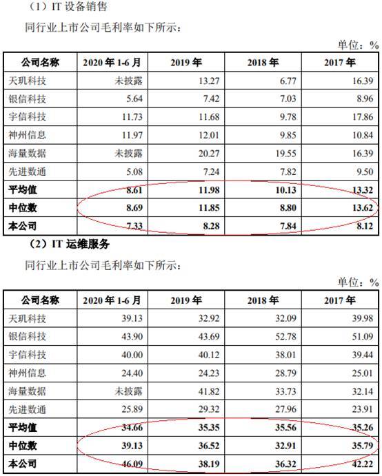2017年至2020年1-6月,亚康万玮IT设备销售业务同行业上市公司毛利率平均值分别为13.32%、10.13%、11.98%、8.61%,IT运维服务业务毛利率平均值分别为35.26%、35.56%、35.35%、34.66%。