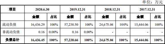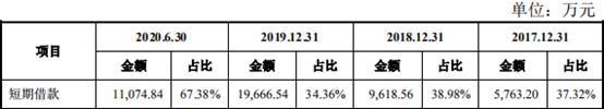 2017年至2020年1-6月,亚康万玮短期借款分别为5763.20万元、9618.56万元、1.97亿元、1.11亿元,占流动负债比例分别为37.32%、38.98%、34.36%、67.38%。