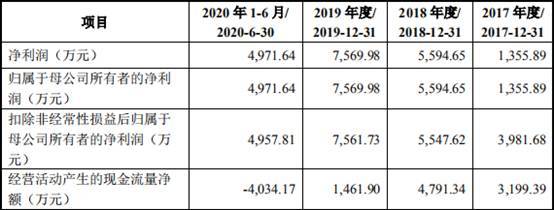 2017年至2020年1-6月,亚康万玮归母净利润分别为1355.89万元、5594.65万元、7569.98万元、4971.64万元,经营活动产生的现金流量净额分别为3199.39万元、4791.34万元、1461.90万元、-4034.17万元。