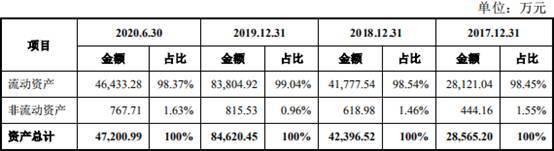 2017年至2020年1-6月,亚康万玮资产总计分别为2.86亿元、4.24亿元、8.46亿元、4.72亿元,其中,流动资产分别为2.81亿元、4.18亿元、8.38亿元、4.64亿元,非流动资产分别为444.16万元、618.98万元、815.53万元、767.71万元。