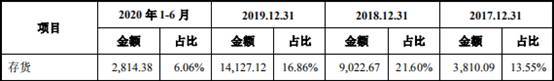 2017年至2020年1-6月,亚康万玮存货账面价值分别为3810.09万元、9022.67万元、1.41亿元、2814.38万元,占流动资产比例分别为13.55%、21.60%、16.86%、6.06%。