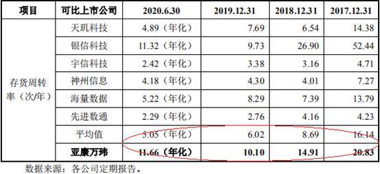 2017年至2020年1-6月,亚康万玮存货周转率分别为20.83次、14.91次、10.10次、11.66次,同行业上市公司平均值分别为16.14次、8.69次、6.02次、5.05次。