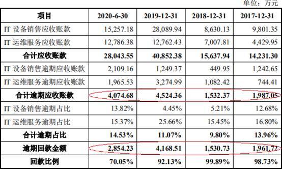 2017年至2020年1-6月,亚康万玮逾期应收账款分别为1987.05万元、1532.37万元、4524.36万元、4074.68万元,逾期回款金额分别为1961.72万元、1530.73万元、4168.51万元、2854.23万元。