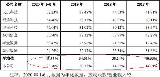 2017年至2020年1-6月,亚康万玮应收账款余额占营业收入比例分别为18.01%、14.32%、30.32%、23.70%,同行业上市公司期末应收账款占营业收入比例平均值为40.33%、35.24%、34.01%、45.55%。