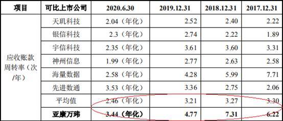 2017年至2020年1-6月,亚康万玮应收账款周转率分别为6.22次、7.31次、4.77次、3.44次,同行业上市公司平均值分别为3.30次、3.27次、3.21次、2.46次。