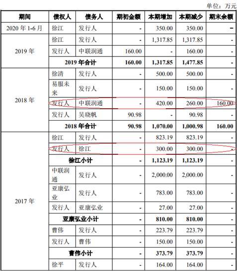 招股书显示,亚康万玮2017年向公司控股股东、实际控制人徐江提供借款300.00万元,2018年向中联润通提供借款420.00万元。