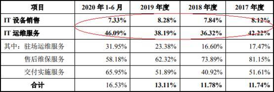 2017年至2020年1-6月,亚康万玮综合毛利率分别为11.74%、11.78%、13.11%、16.53%,其中,IT设备销售毛利率分别为8.12%、7.84%、8.28%、7.33%,IT运维服务毛利率分别为42.22%、36.32%、38.19%、46.09%。