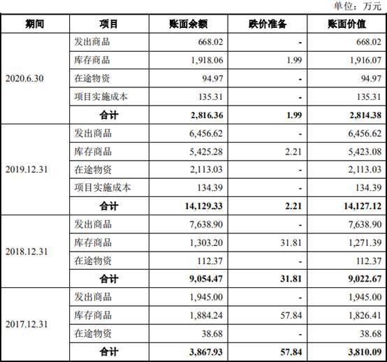 2017年至2020年1-6月,亚康万玮存货账面余额分别为3867.93万元、9054.47万元、1.41亿元、2816.36万元,其中,库存商品分别为1884.24万元、1303.20万元、5425.28万元、1918.06万元。