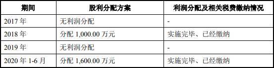 亚康万玮2017年、2019年未进行利润分配,2018年、2020年1-6月分别分配股利1000.00万元、1600.00万元。