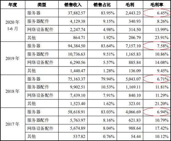 2017年至2020年1-6月,亚康万玮服务器毛利率分别为6.94%、6.71%、7.58%、6.45%。
