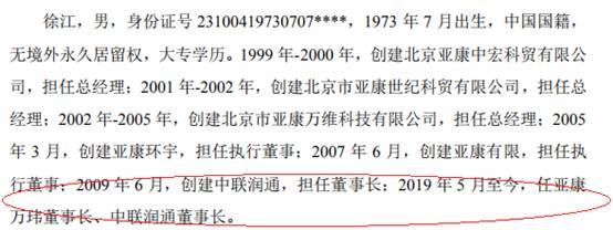 据亚康万玮招股书披露的徐江简历显示,徐江2009年6月创建中联润通,担任董事长;2019年5月至今,任亚康万玮董事长、中联润通董事长。