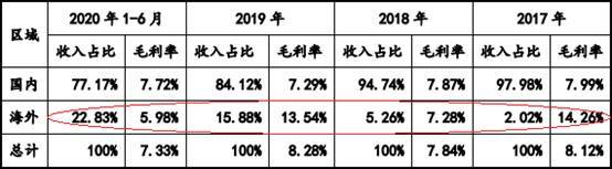 2017年至2020年1-6月,亚康万玮IT设备销售海外收入占比分别为2.02%、5.26%、15.88%、22.83%,同期国内收入占比分别为97.98%、94.74%、84.12%、77.17%。