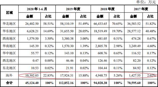 亚康万玮表示,公司的IT设备销售业务主要集中于国内,其中,国内客户主要集中在华北地区、华东地区、华南地区,上述三个地区销售收入之和的比例分别为96.90%、93.33%、80.93%、73.52%,主要是国内互联网产业格局所致。公司海外收入主要来自于香港地区,海外客户主要是百果园、奥飞数据、首都在线等。