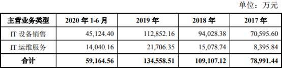 2017年至2020年1-6月,亚康万玮主营业务中,IT设备销售收入分别为7.06亿元、9.40亿元、11.29亿元、4.51亿元,IT运维服务收入分别为8395.84万元、1.51亿元、2.17亿元、1.40亿元。