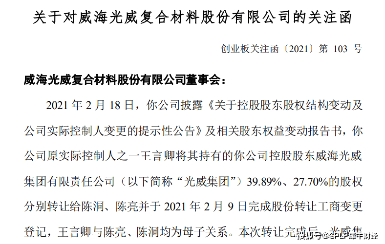 就光威复材实控人变更,2月19日,深交所向光威复材下发关注函。