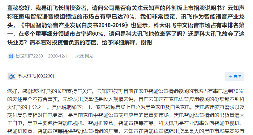去年12月11日,科大讯飞在深交所互动交易平台上直接对云知声的宣传数据提出质疑,并直指其数据造假。
