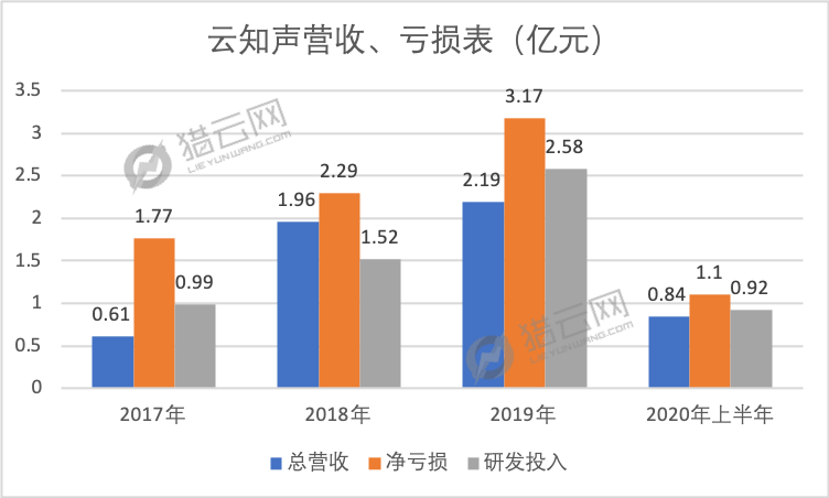 招股书显示,2019年云知声营收2.2亿元,同比增长12%,同期净利润亏损2.9亿元,亏损幅度同比扩大33%。2020年上半年,云知声的营收为8469万元,亏损1.1亿元。