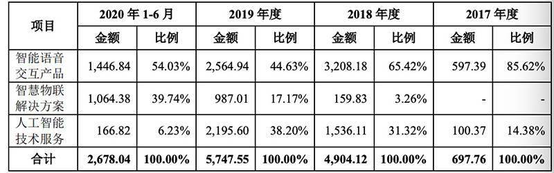 从产品在主营业务收入比重也可以看出来,云知声逐渐向智慧物联网方向发展。其中,智能语音交互产品从2017年营收占比96.93%下滑至2020年上半年的28.18%,而智慧物联解决方案比重从0%上升至67.25%。此外,人工智能技术服务从2017年的3%占比,在2019年升为14.44%,2020年上半年却又下降到了4.56%。