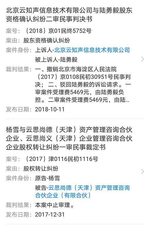 从2016年4月起,陆勇毅将云知声起诉至北京市海淀区人民法院请求确认其股东资格。一审裁定书显示,确定陆勇毅的股东资格。但云知声再次提起上诉,这次上诉又驳回了陆勇毅股东资格确认的诉讼请求。