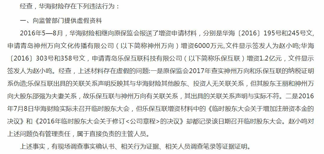 2019年7月,银保监会再次通报称因华海保险拟任副总经理于晖、拟任总经理助理唐海明,截至检查日均未获得相关披露,但在实际工作中履行相关职务被罚37万元。同时,结合车险业务虚列费用和违规销售华海康盈投资型产品的违法违规行为共计罚款187万元。值得一提的是,公司法人、董事长赵小鸣在这些罚单中均被提及。