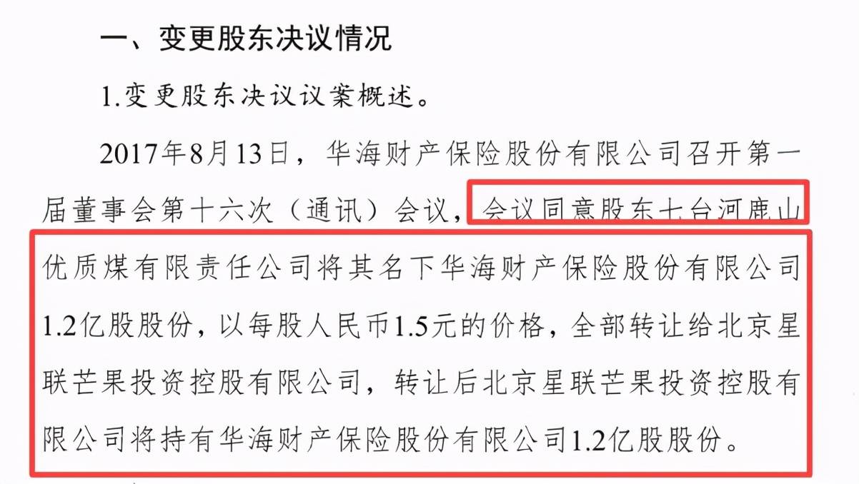 值得注意的是,这并非鹿山优质煤首次进行股权转让。华海保险官网信息显示,2017年8月,华海保险董事会会议同意鹿山优质煤将其名下1.2亿股股份,以每股人民币1.5元的价格全部转让给北京星联芒果投资控股有限公司。但此笔股权转让在披露公告后便陷入沉寂。