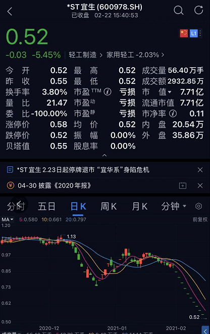 *ST宜生(600978)2月22日晚间公告,公司收到上交所的事先告知书,截至2月22日,公司股票已连续20个交易日每日收盘价均低于1元;公司股票已经触及终止上市条件。上交所根据相关规定,拟对公司股票作出终止上市的决定。