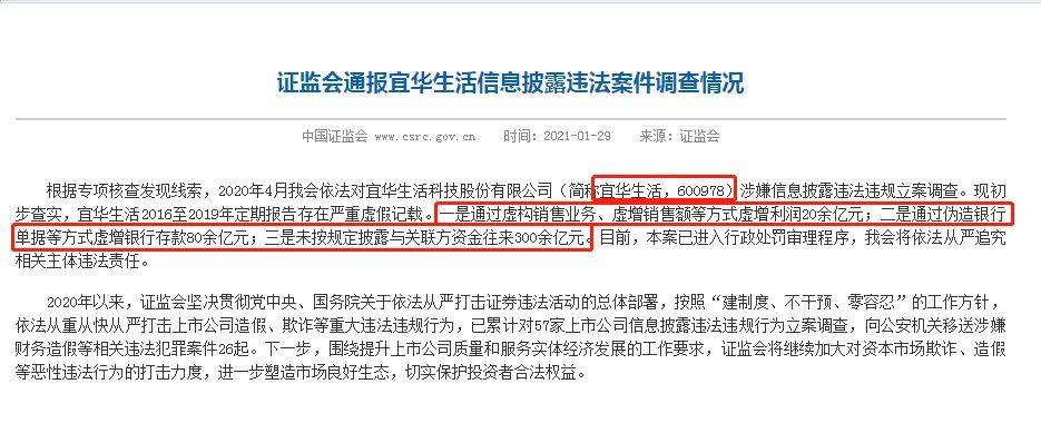 中国证监会1月29日盘后通报,*ST宜生涉嫌2016年至2019年定期报告存在严重虚假记载。